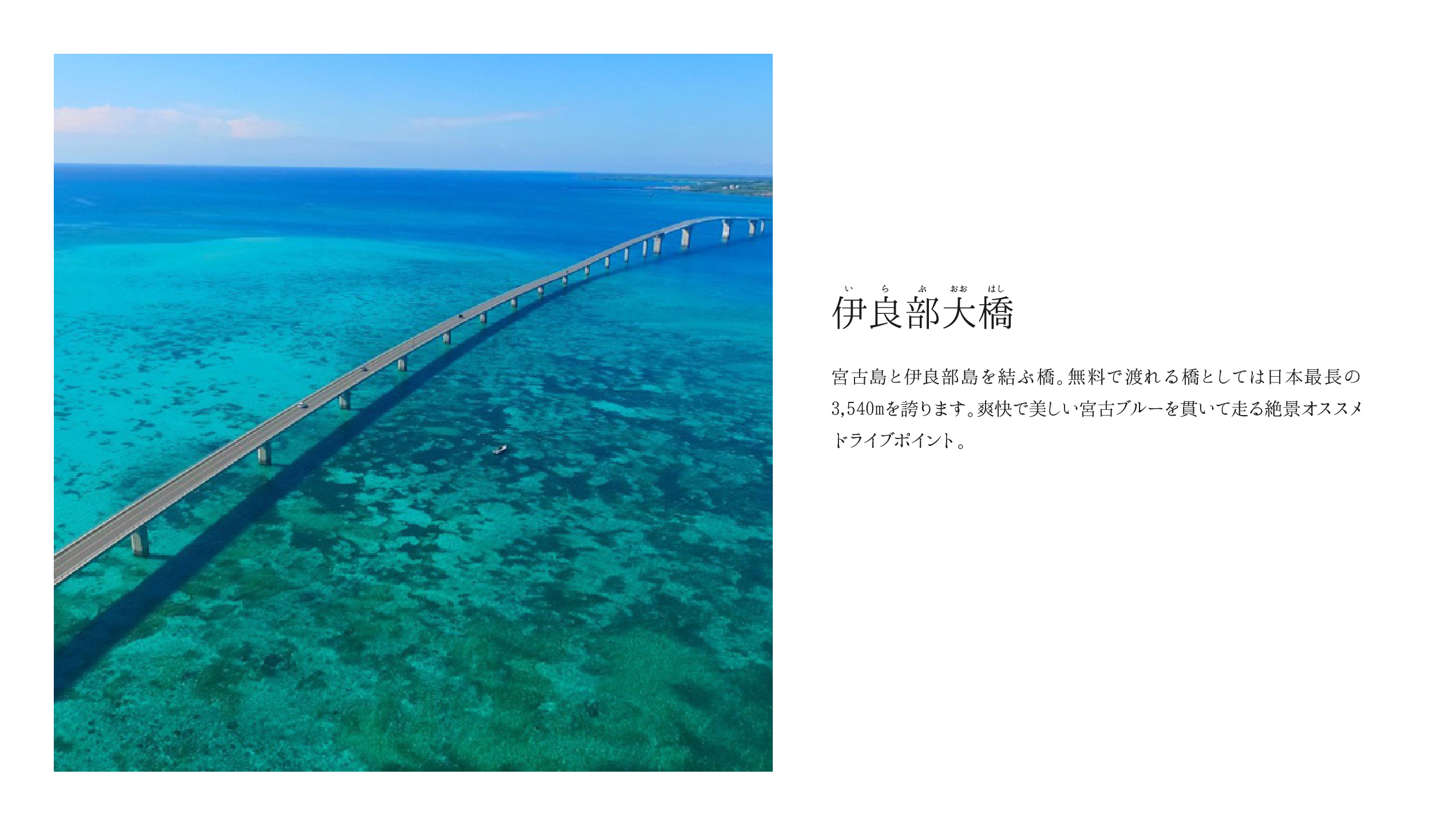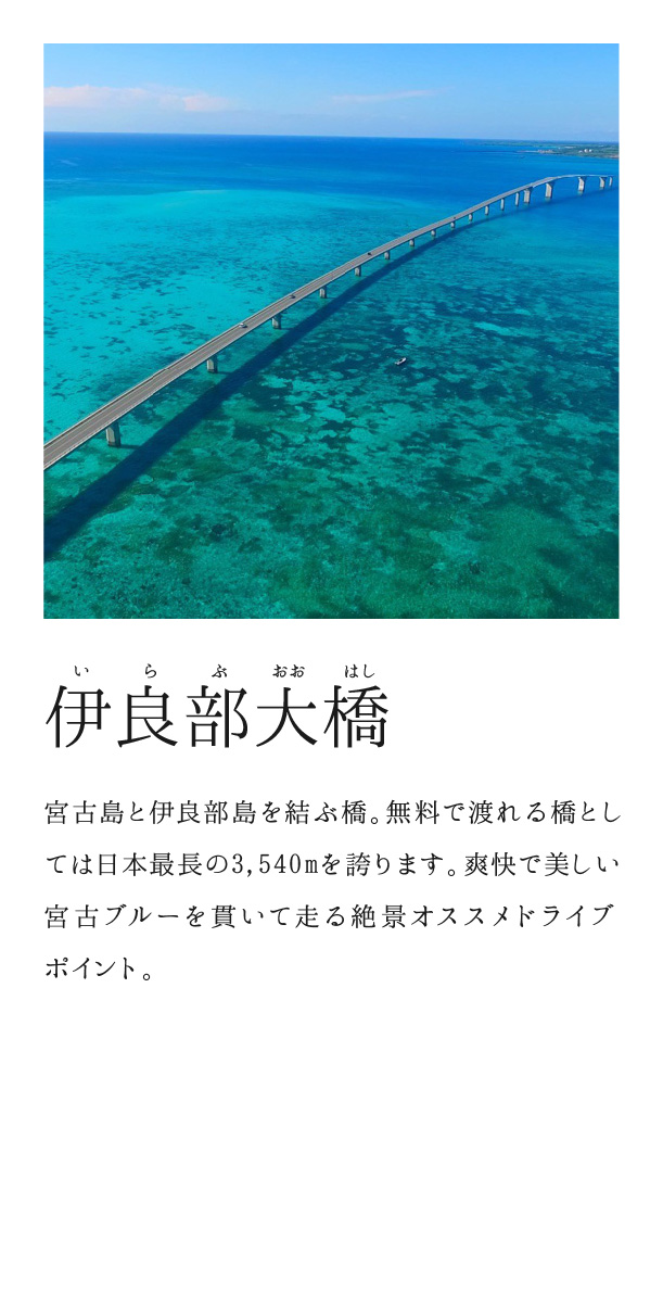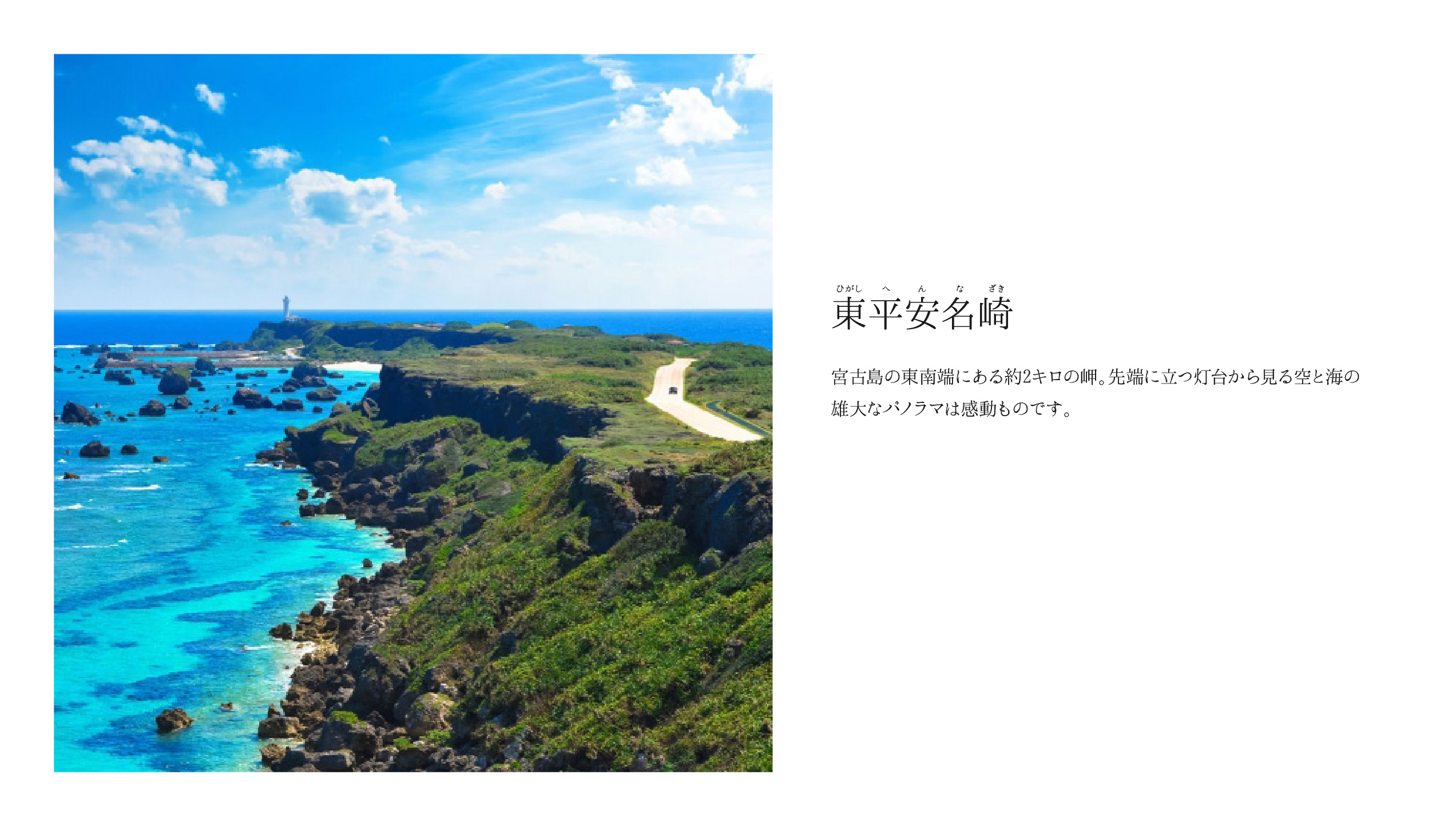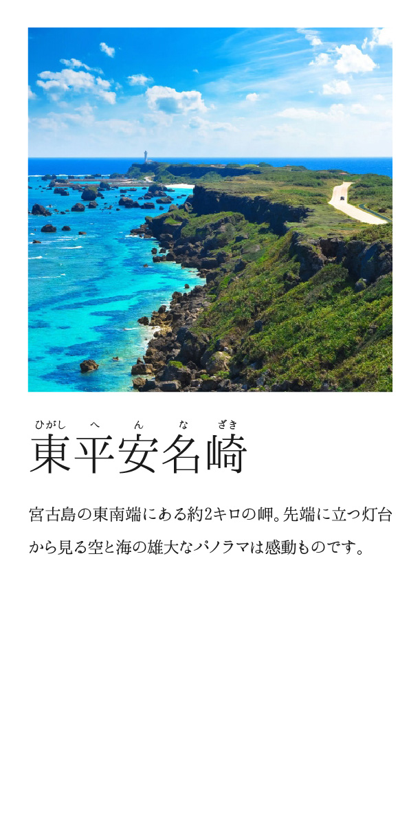 沖縄本島からおよそ300km南西に位置する宮古島は、マリンレジャーやグルメはもちろん、東洋一と呼ばれるパウダーサンドの「与那覇前浜ビーチ」や、日本都市公園百景のひとつにも数えられる「東平安名崎」など、 絶景スポットが数多く存在します。